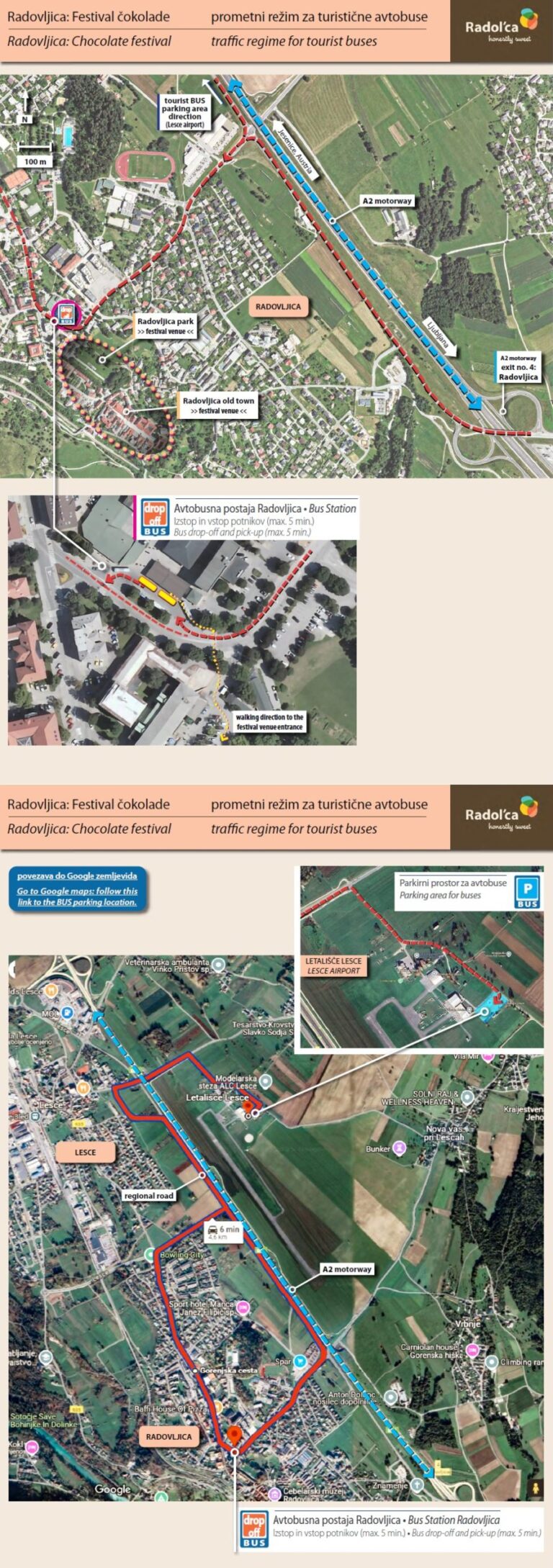 During the festival, announced groups arriving with Tourist buses will be allowed access to main bus station in Radovljica (Kranjska cesta 9, 4240 Radovljica). The bus stop is located only 50 metres away from the festival venue. Bus access will be permitted for short stops only (group drop off and pick up). Parking of tourist buses will be arranged at Lesce sports airfield. Parking for tourist buses if free of charge, a special free shuttle bus between bus parking and festival venue will be organised for bus drivers that would like to visit the festival.